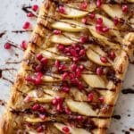 This Apple Brie & Caramelized Onion Tart combines sweet, savory, and tangy flavors with a flaky puff pastry crust. Caramelized onions provide a rich base, complemented by creamy brie and thinly sliced apples. Topped with pomegranate arils and a drizzle of pomegranate molasses, this tart offers a beautiful balance perfect for a warm appetizer or light meal.