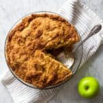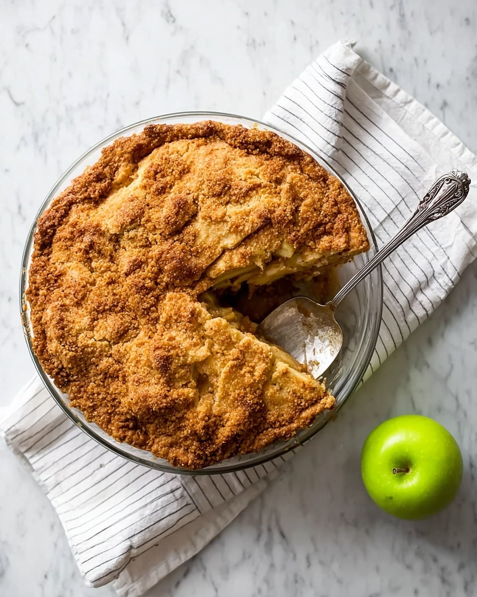A golden-brown pie with a crumbly, textured top layer sits in a clear glass pie dish on a white marbled surface. A vintage silver pie server is lifting one slice, showing the pie’s slightly moist and dense interior. Next to the pie is a white cloth with thin gray stripes and a bright green apple placed beside it. The scene is bright and clean, with soft shadows giving depth to the pie and surrounding items. photo taken with an iphone --ar 4:5 --v 7