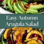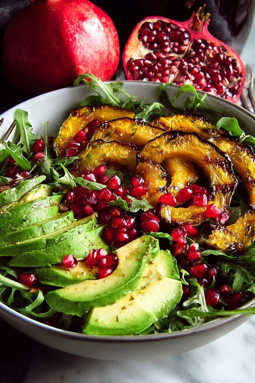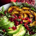 This Autumn Arugula Salad is a vibrant, nutrient-packed dish featuring caramelized acorn squash, toasted spiced pecans, fresh avocado, pomegranate arils, and crisp cucumber, all tossed in a tangy pomegranate ginger vinaigrette. Perfect for a seasonal light lunch or a colorful side to your fall meals.