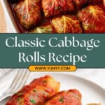 Classic cabbage rolls filled with a savory mixture of ground beef, ground pork, and parboiled rice, seasoned with herbs and spices, then baked in a rich tomato sauce. This hearty and comforting dish is perfect for family meals and can be easily reheated as leftovers.