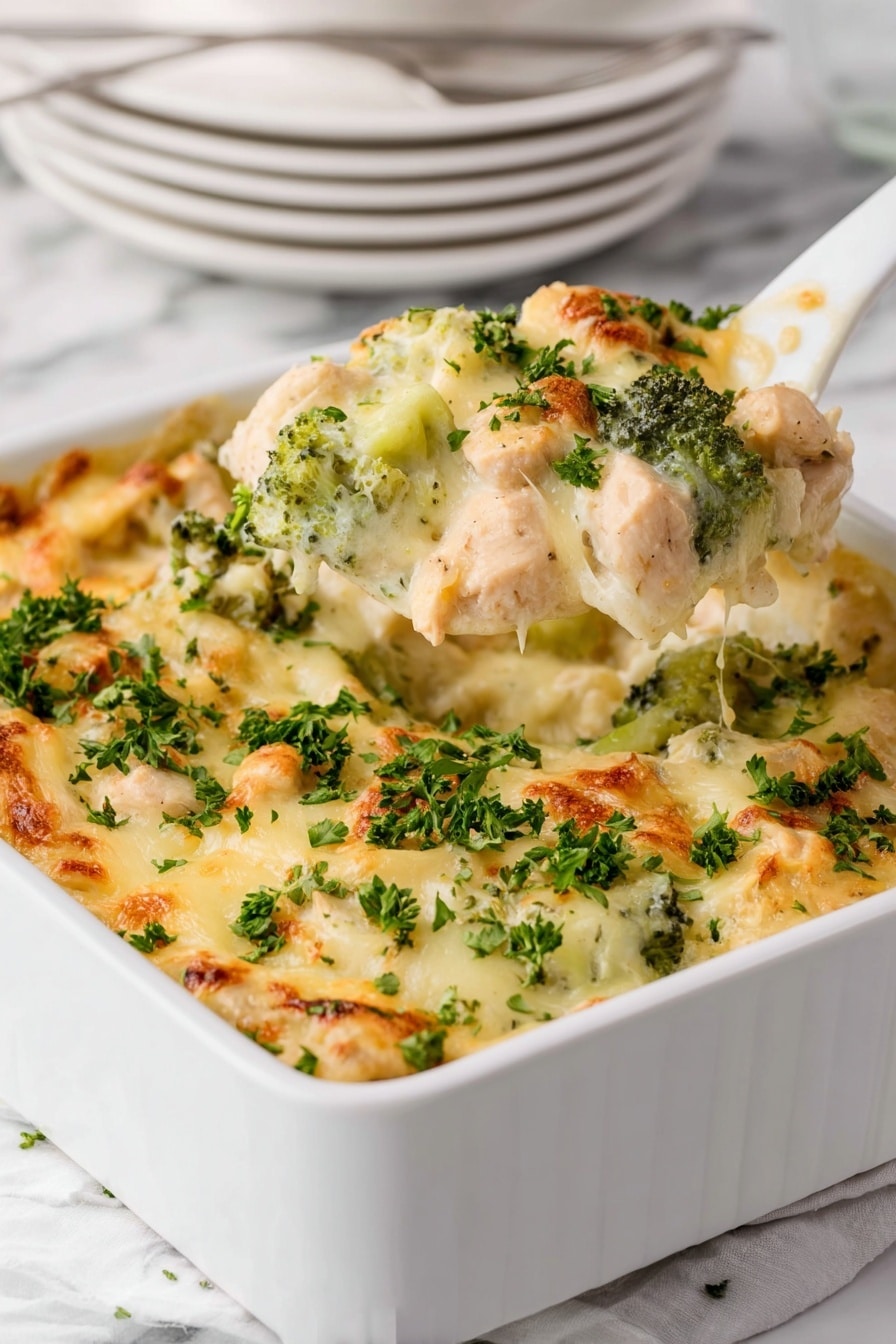 This Baked Chicken Alfredo recipe combines tender rotisserie chicken, fresh broccoli, and pasta in a creamy homemade Alfredo sauce made with Greek yogurt, Parmesan, and mozzarella. Baked until bubbly and golden, this comforting casserole is perfect for weeknight dinners or meal prepping.