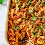 This TikTok-inspired Baked Feta Pasta is a creamy, flavorful dish featuring roasted cherry tomatoes, sun-dried tomatoes, and a block of feta cheese baked until soft and mixed with al dente pasta. Tossed with fresh garlic, basil, and a hint of pesto, this recipe delivers a rich and comforting meal that’s easy to prepare and perfect for weeknight dinners.