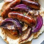 Layer your creamy garlic roasted mashed potatoes on the plate, nestle the browned sausages on top, and pour generous globs of that silky sausage gravy all over. Finally, crown the dish with a pile of those gorgeous caramelized onions. I love the mix of textures and flavors in every bite — rich, sweet, savory, and creamy. It’s truly a hug on a plate!
