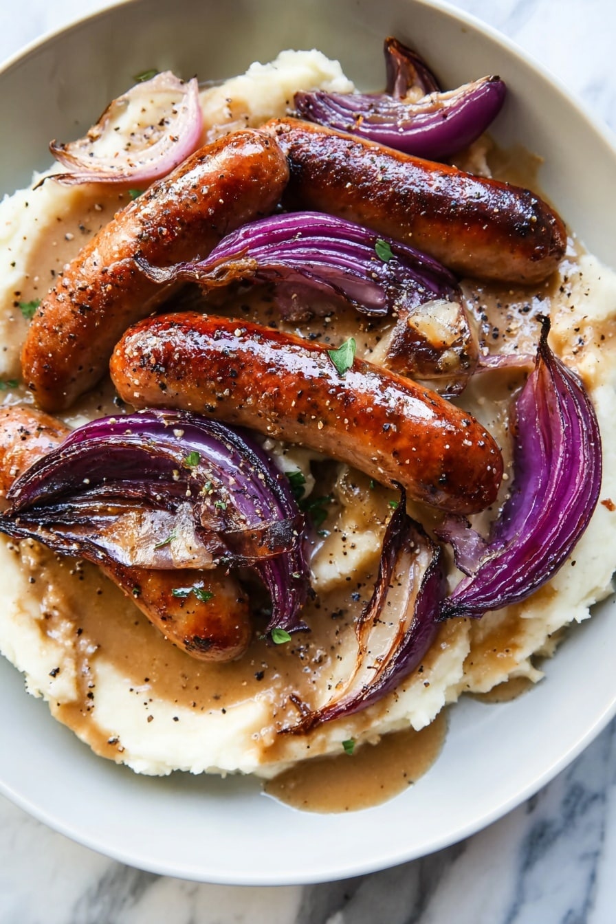 Each ingredient plays a key role in bringing this dish together. The onion’s natural sweetness shines through with a hint of balsamic tang, while the sausages provide savory depth that balances the creamy mashed potatoes. I recommend choosing high-quality pork sausages for the best flavor and texture.
