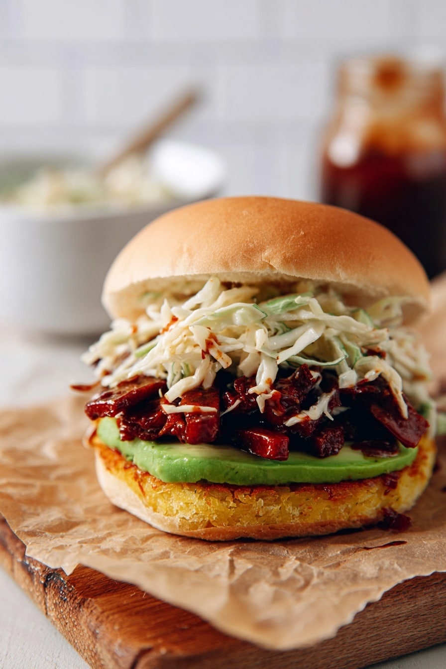 This BBQ Tempeh Sandwich recipe features flavorful, crispy tempeh coated in a tangy BBQ sauce, paired with a creamy, spicy sriracha slaw. Perfect for a vegan lunch or dinner, it combines smoky, sweet, and spicy flavors with fresh avocado and your choice of bread to create a satisfying and wholesome sandwich.