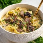 This hearty Beef Stroganoff Soup combines tender strips of beef sirloin with cremini mushrooms, onions, and egg noodles simmered in a rich, flavorful broth. Enhanced with sour cream and fresh parsley, this comforting soup offers all the classic flavors of traditional Beef Stroganoff in a warm, satisfying bowl perfect for chilly days.