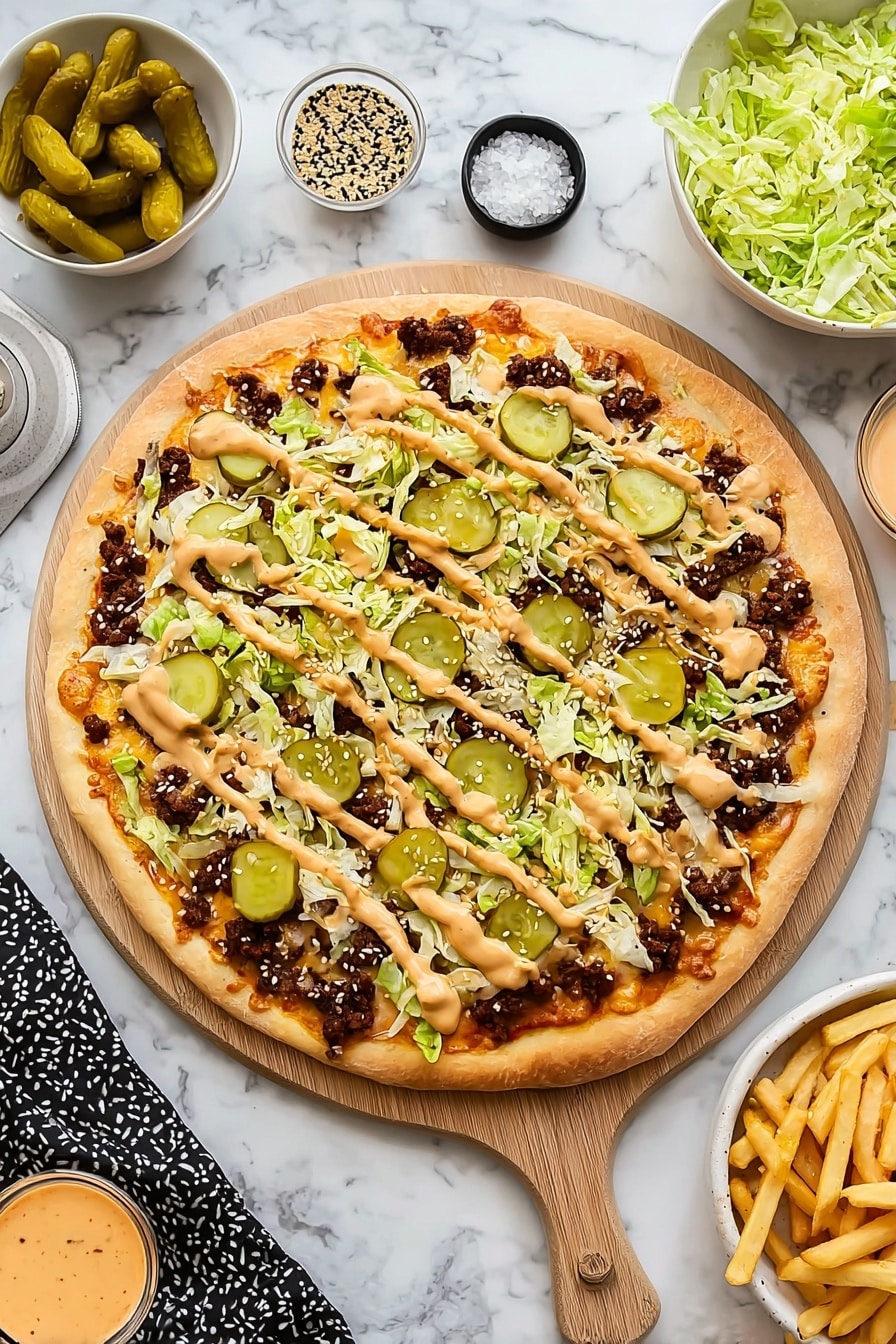 I always top my Big Mac Pizza Recipe with freshly shredded iceberg lettuce and a few extra pickle slices on the side – it keeps things bright and fresh. Adding a little extra sesame seed sprinkle is my secret final touch that no one can resist.