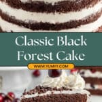 This Black Forest Cake recipe features moist and rich chocolate cake layers soaked with a cherry-infused Kirschwasser syrup, layered with luscious whipped cream frosting and sweet cherries. Topped with chocolate shavings and whole cherries, this classic German dessert combines deep chocolate flavors with fruity freshness, perfect for special occasions or indulgent treats.