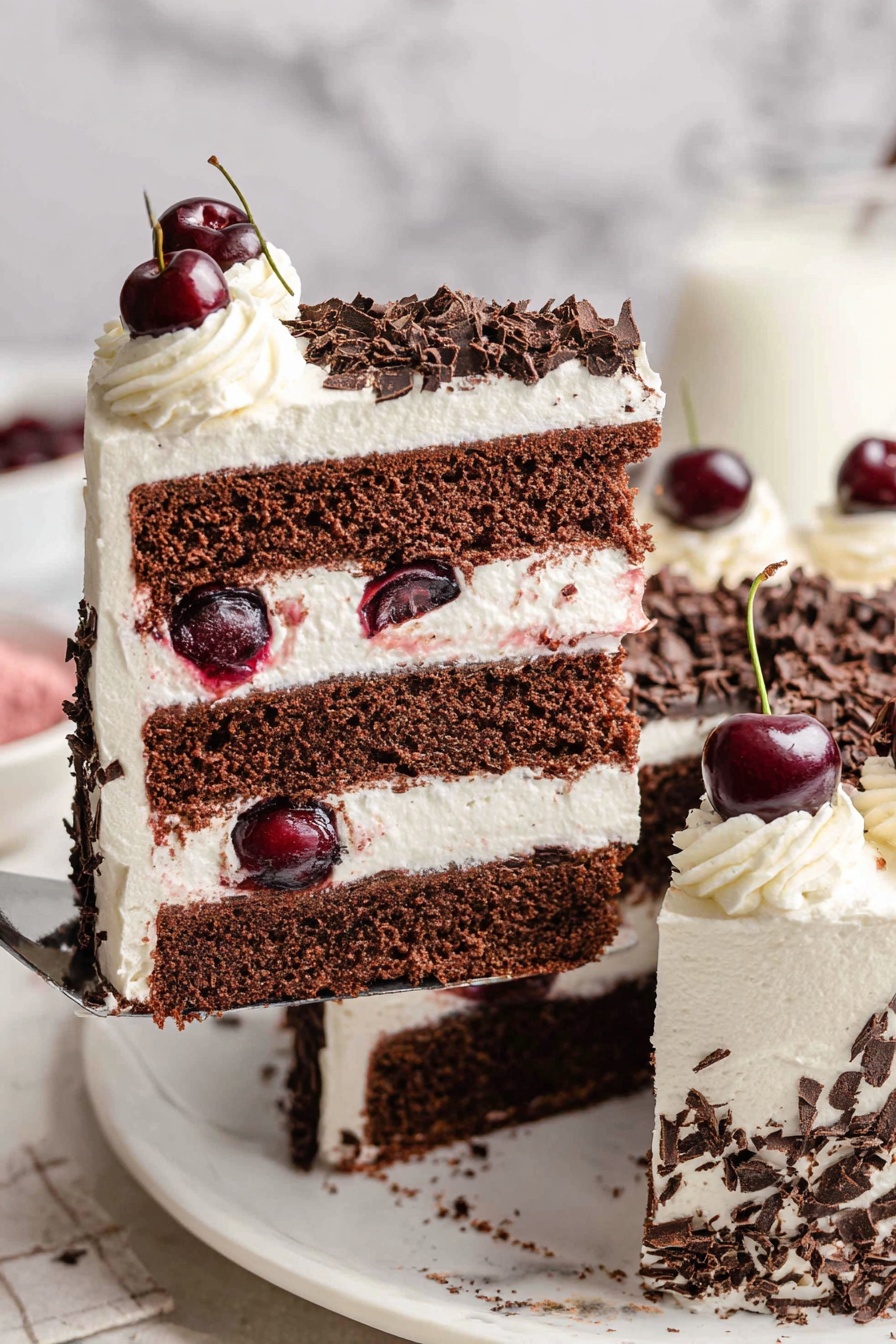 This Black Forest Cake recipe features moist and rich chocolate cake layers soaked with a cherry-infused Kirschwasser syrup, layered with luscious whipped cream frosting and sweet cherries. Topped with chocolate shavings and whole cherries, this classic German dessert combines deep chocolate flavors with fruity freshness, perfect for special occasions or indulgent treats.