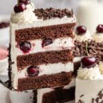 This Black Forest Cake recipe features moist and rich chocolate cake layers soaked with a cherry-infused Kirschwasser syrup, layered with luscious whipped cream frosting and sweet cherries. Topped with chocolate shavings and whole cherries, this classic German dessert combines deep chocolate flavors with fruity freshness, perfect for special occasions or indulgent treats.