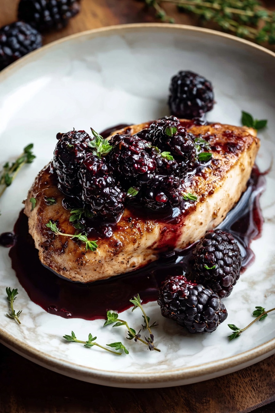 - Serve: Plate the chicken breasts, spoon generous amounts of blackberry glaze on top, and garnish with reserved fresh blackberries and sprigs of fresh thyme for an aromatic finish.