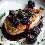 - Serve: Plate the chicken breasts, spoon generous amounts of blackberry glaze on top, and garnish with reserved fresh blackberries and sprigs of fresh thyme for an aromatic finish.