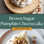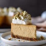 This Brown Sugar Pumpkin Cheesecake with a Pistachio Macaroon Crust is a decadent autumn dessert perfect for holiday gatherings. Featuring a crunchy, buttery pistachio and coconut crust, a spiced pumpkin cheesecake filling, and topped with a crunchy pistachio coconut crumble alongside whipped cream, this cheesecake combines rich textures and warm flavors for a festive treat.