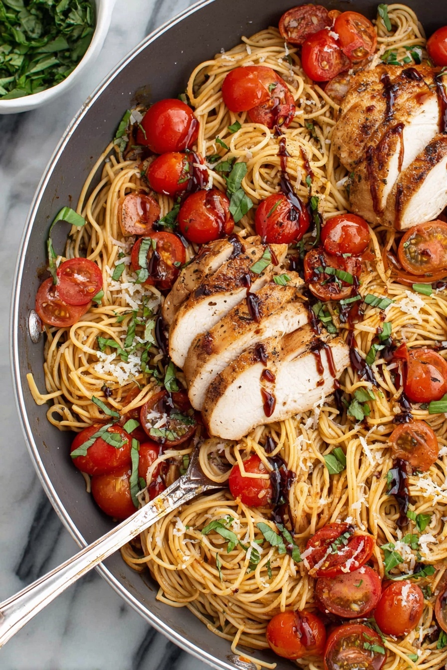 - Add Toppings and Serve: Sprinkle the freshly shredded parmesan cheese and remaining 2 tablespoons of chopped fresh basil over the chicken and pasta. If desired, drizzle 1-2 tablespoons of balsamic glaze for an extra burst of flavor. Serve immediately while hot.