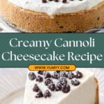 This luscious Cannoli Cheesecake recipe combines the creamy richness of ricotta and mascarpone cheeses with the crisp, cinnamon-kissed crust inspired by traditional cannoli shells. Baked in a water bath for a silky texture and topped with a light ricotta whipped cream and mini chocolate chips, this cheesecake offers all the classic cannoli flavors in a deliciously smooth dessert perfect for celebrations or a decadent treat.