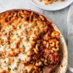 - Assemble Casserole: Transfer the pasta and meat mixture to the prepared casserole dish, spreading it evenly. Sprinkle the remaining cheese evenly over the top.