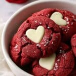 These Chewy Valentine’s Day Red Velvet Cookies combine rich cocoa flavor with a vibrant red hue and a tender, chewy texture. Finished with a delightful Reese’s white chocolate peanut butter heart on top, these cookies are perfect for a festive and romantic treat.