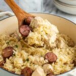 - Add Broth and Bouillon: Stir in the chicken broth and chicken bouillon cubes, then add 7 cups of the prepared chicken broth to the sausage and onion mixture.