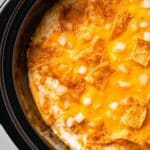 A hearty and comforting Chili Cheese Casserole made in the slow cooker, combining crunchy Fritos, savory chili, sharp cheddar cheese, sour cream, and fresh onions for a delicious, easy-to-prepare meal perfect for family dinners or casual gatherings.