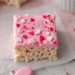 - Dip and Decorate: Dip half of each Rice Krispie treat bar into the melted candy coating. Place the dipped bars on a parchment-lined baking sheet, sprinkle with Valentine’s Day sprinkles, and let them set for several minutes until firm.