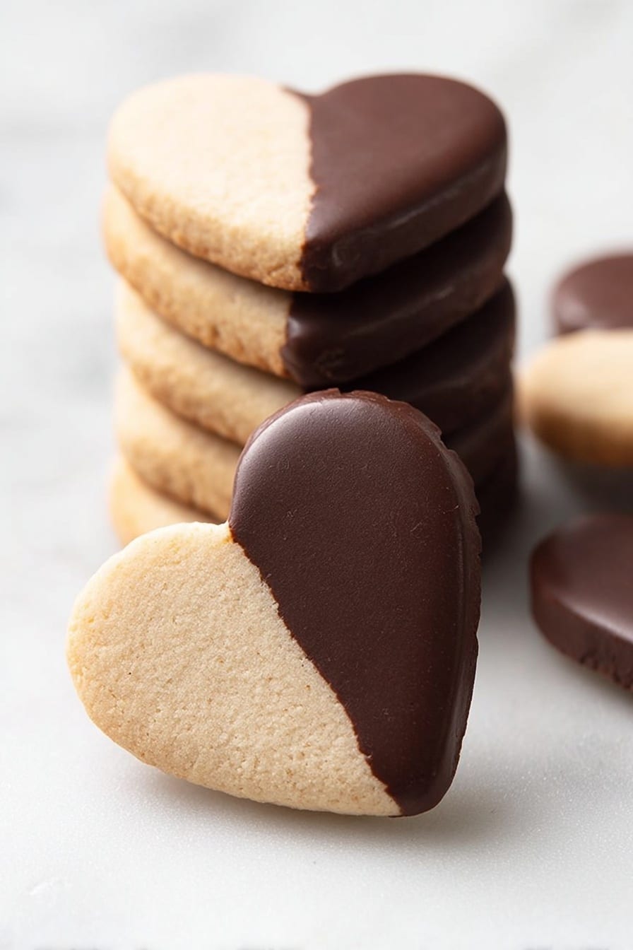 These Chocolate-Dipped Shortbread Heart Cookies are a delightful treat perfect for any occasion. Tender, buttery shortbread cookies are baked to a golden perfection, then dipped in smooth, melted semi-sweet chocolate and adorned with colorful sprinkles for a charming finish. Simple to make at home, these cookies balance rich chocolate flavor with a delicate, crumbly texture.