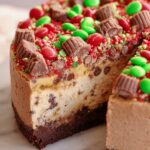 This decadent Chocolate Mocha Cheesecake combines a crunchy almond and graham cracker crust with a rich, creamy chocolate-studded filling. Topped with a luscious mocha whipped cream and sprinkled with festive candies, it’s a perfect indulgence for coffee and chocolate lovers.