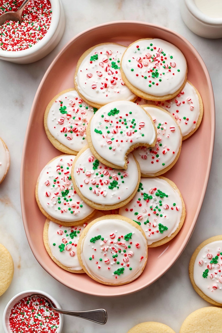 A pale pink oval plate filled with a pile of round sugar cookies, each with one layer of smooth white icing on top, decorated with small red and white candy cane-shaped sprinkles, tiny white snowflake sprinkles, and small green leaf-shaped sprinkles scattered evenly. One cookie at the front has a bite taken out of it, showing the golden-brown cookie base. Around the plate are plain round sugar cookies, a small white bowl filled with the same red, white, and green festive sprinkles, and a white bowl with a spoon resting inside it, placed on a white marbled surface. photo taken with an iphone --ar 2:3 --v 7 - Christmas Shortbread Cookies, holiday butter cookies, festive shortbread, easy Christmas cookies, melt-in-your-mouth holiday treats
