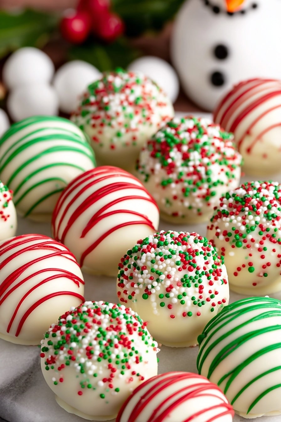 Delightful Christmas Sugar Cookie Balls made with soft cream cheese and sweet Lofthouse cookies, coated in smooth white chocolate and decorated with festive sprinkles and optional colorful candy melts. Perfect bite-sized treats for holiday gatherings and gift giving.