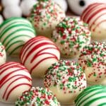 Delightful Christmas Sugar Cookie Balls made with soft cream cheese and sweet Lofthouse cookies, coated in smooth white chocolate and decorated with festive sprinkles and optional colorful candy melts. Perfect bite-sized treats for holiday gatherings and gift giving.