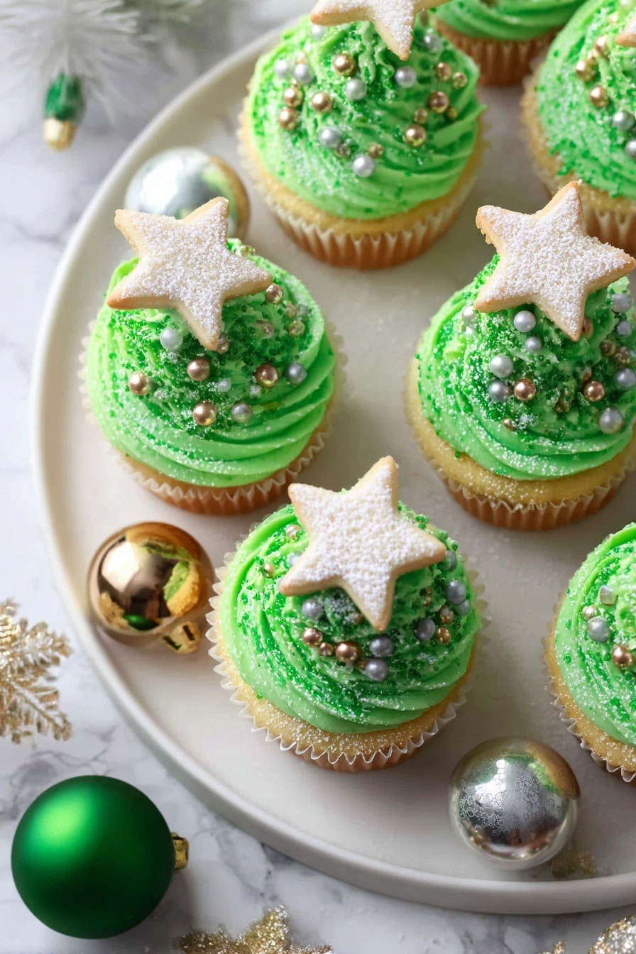 Delight in these festive Christmas Tree Cupcakes, perfect for holiday celebrations. Fluffy, moist cupcakes are topped with a creamy, vibrant green buttercream frosting piped to look like Christmas trees, adorned with colorful sprinkles and decorations to bring holiday cheer to your dessert table.