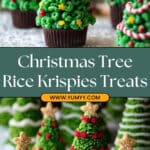 Celebrate the holidays with these festive Christmas Tree Rice Krispies Treats, featuring classic marshmallow and butter coated cereal shaped into trees, tinted green with gel food coloring, and decorated with colorful sprinkles and mini Reese’s peanut butter cups as bases. These easy-to-make treats are perfect for holiday parties and family gatherings.