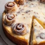 - Glaze and serve: Drizzle the glaze evenly over the top of the cheesecake. For an optional garnish, top with store-bought mini cinnamon rolls to enhance the cinnamon roll theme. Slice into 14 pieces and enjoy your decadent Cinnamon Roll Cheesecake!