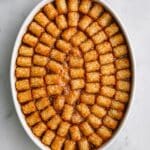 - Top with Tater Tots and Bake: Arrange the frozen tater tots in a single layer over the cheese. Bake uncovered for 40 to 45 minutes until the casserole is bubbly and the tater tots are golden and crispy.