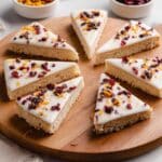Delight in these festive Cranberry Bars topped with a luscious cream cheese frosting. Featuring a buttery, tender base studded with white baking chips, dried cranberries, and crunchy walnuts, these bars offer a perfect balance of sweet and tart flavors. Finished with a smooth cream cheese frosting enhanced by a hint of orange zest and sprinkled with more dried cranberries, they make a festive treat ideal for holiday gatherings or anytime you crave a fruity, creamy dessert bar.