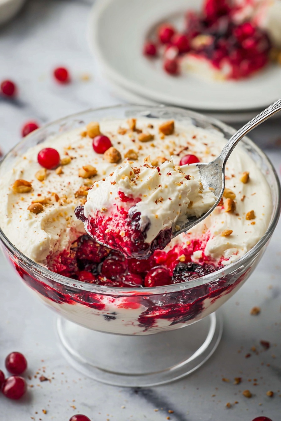 A close-up of a spoonful of layered dessert shows three clear layers: the bottom is translucent bright red jelly with chunks of fruit, the middle is a shiny, slightly wobbly red jelly layer, and the top is thick, creamy white whipped topping sprinkled with crushed golden brown nuts. The spoon hovers above a round clear glass dish filled with the same dessert, with more whipped topping spread evenly and decorated with red berries and nut crumbs. The background has a soft focus on white stacked plates and a red and white striped cloth, all placed on a white marbled surface. photo taken with an iphone --ar 2:3 --v 7 - Cranberry Jello Salad with Cream Cheese Topping, holiday cranberry jello salad, fruit jello salad, festive jello dessert, easy holiday side dish