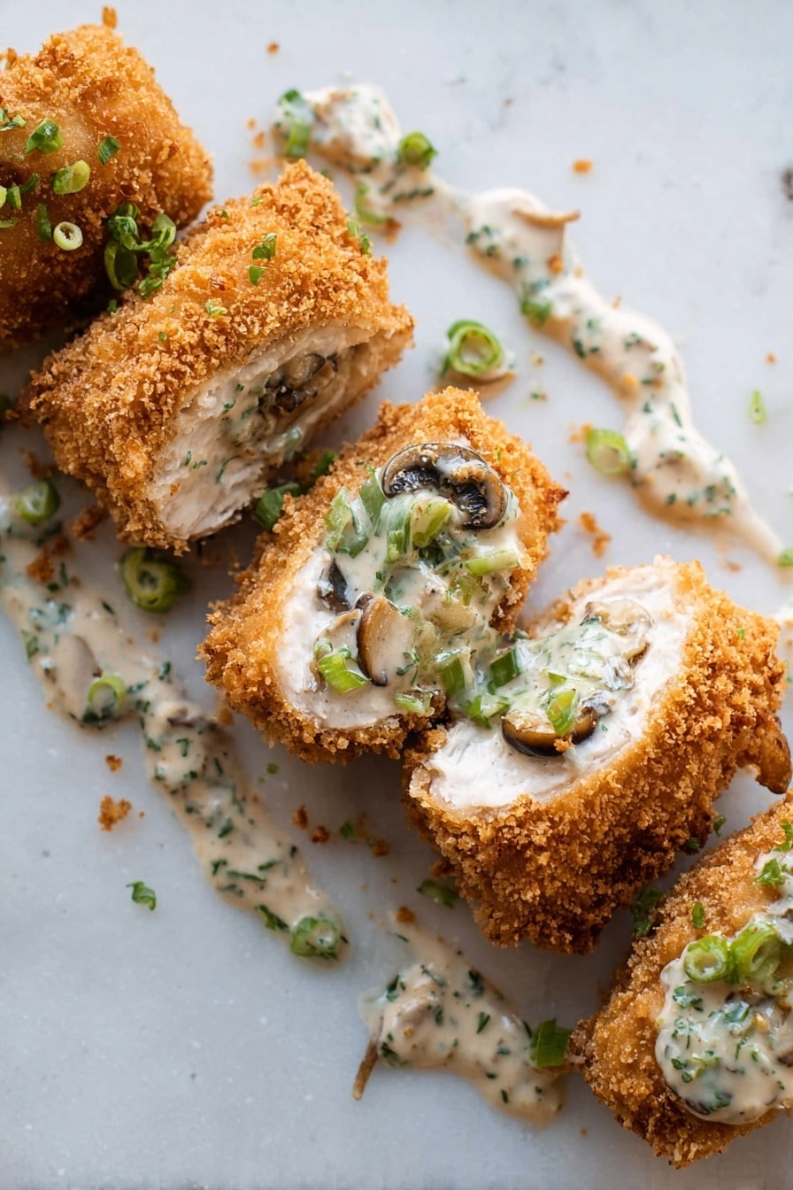 This Creamy Chicken Roulade with Spinach and Mushrooms is a deliciously elegant main dish featuring tender chicken breasts stuffed with sautéed mushrooms, onions, and spinach, then rolled and coated with crispy panko breadcrumbs. Served with a rich and creamy homemade Alfredo sauce flavored with Parmesan and parsley, this recipe is perfect for a special dinner or weekend meal. You can fry, air fry, or bake the roulades to achieve a golden brown crust, making it versatile based on your preferred cooking method.
