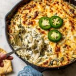 This creamy jalapeño spinach artichoke dip is a perfect blend of spicy, cheesy, and savory flavors, ideal for parties or casual snacking. Made with fresh spinach, marinated artichoke hearts, jalapeño peppers, cream cheese, Greek yogurt, and a blend of mozzarella and parmesan cheeses, it’s baked to golden perfection in a cast iron skillet and served warm with your choice of chips or veggies.