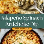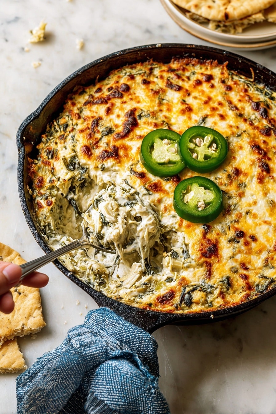 Absolutely! You can simply omit the jalapeños or replace them with a small amount of mild green bell pepper for color without heat. The dip will still be creamy and flavorful thanks to the artichokes, spinach, and cheeses.