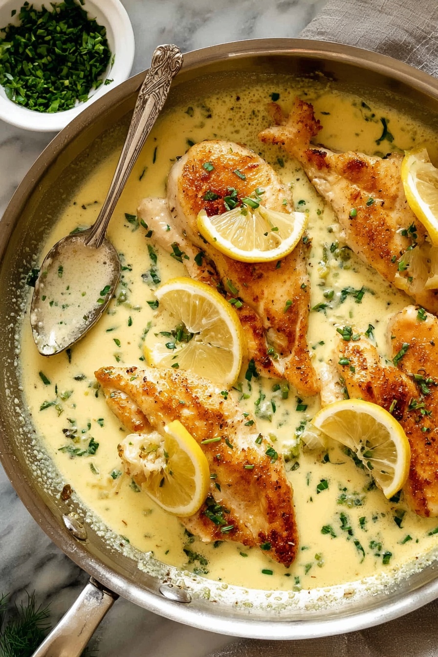 This Creamy Lemon Chicken Breast recipe features tender, thinly sliced chicken breasts pan-fried to a crispy golden finish and smothered in a luscious lemon-parmesan cream sauce. Quick and easy to prepare, it’s perfect served over linguine or mashed potatoes, garnished with fresh parsley for a bright, flavorful weeknight dinner.