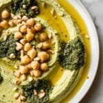 Transfer the hummus to a pretty serving bowl, then drizzle extra virgin olive oil on top for that glossy look. I love sprinkling roasted sesame seeds and reserving a few chickpeas to scatter on top. For a pop of color and that pesto punch, add a few spoonfuls of basil pesto right over the surface. Your guests will think you spent hours on it!