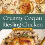 Coq au Riesling is a classic French-inspired dish featuring tender chicken thighs simmered in a rich, creamy Riesling wine sauce with mushrooms, bacon, and fresh herbs. This comforting and flavorful recipe balances the savory depth of seared chicken with the brightness of white wine and cream, perfect for a special weeknight dinner or entertaining guests.