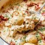 This Creamy Sun Dried Tomato Chicken Gnocchi is a rich and comforting dish featuring tender chicken tenders and pillowy gnocchi in a luscious sun dried tomato cream sauce. The sauce is made from aromatic garlic, tangy sun dried tomatoes, milk, half and half, and Parmesan cheese, thickened to perfection with cornstarch. Garnished with fresh parsley, this recipe is a delightful blend of creamy textures and robust flavors, perfect for a cozy weeknight dinner.