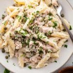 A quick and creamy tuna pasta recipe featuring penne pasta tossed in a lemony garlic cream cheese sauce with capers and parmesan, garnished with fresh parsley and lemon zest. Perfect for a flavorful weeknight meal that comes together in just 15 minutes.