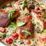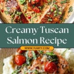 This Creamy Tuscan Salmon recipe features tender salmon fillets cooked to golden perfection and served with a rich, flavorful creamy sauce bursting with sun-dried tomatoes, cherry tomatoes, garlic, spinach, and Parmesan cheese. It’s a comforting yet elegant dish perfect for a quick weeknight dinner or a special occasion.