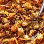 For special occasions, I’ve served this Croissant Stuffing with Sausage, Apples, Cranberries, and Herbs Recipe inside hollowed-out acorn squash or in mini cast iron skillets. It adds a charming rustic touch and makes the table look so inviting.