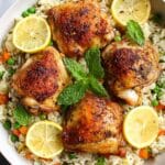 Arroz con Pollo is a classic Latin American dish featuring tender chicken pieces cooked with aromatic vegetables, herbs, and rice, all simmered together to create a flavorful and comforting one-pot meal. This recipe uses bone-in, skin-on chicken thighs and legs sautéed to golden perfection, then slow-cooked with fragrant spices, fresh mint, and vibrant vegetables, resulting in a moist, savory, and satisfying dish perfect for family dinners.