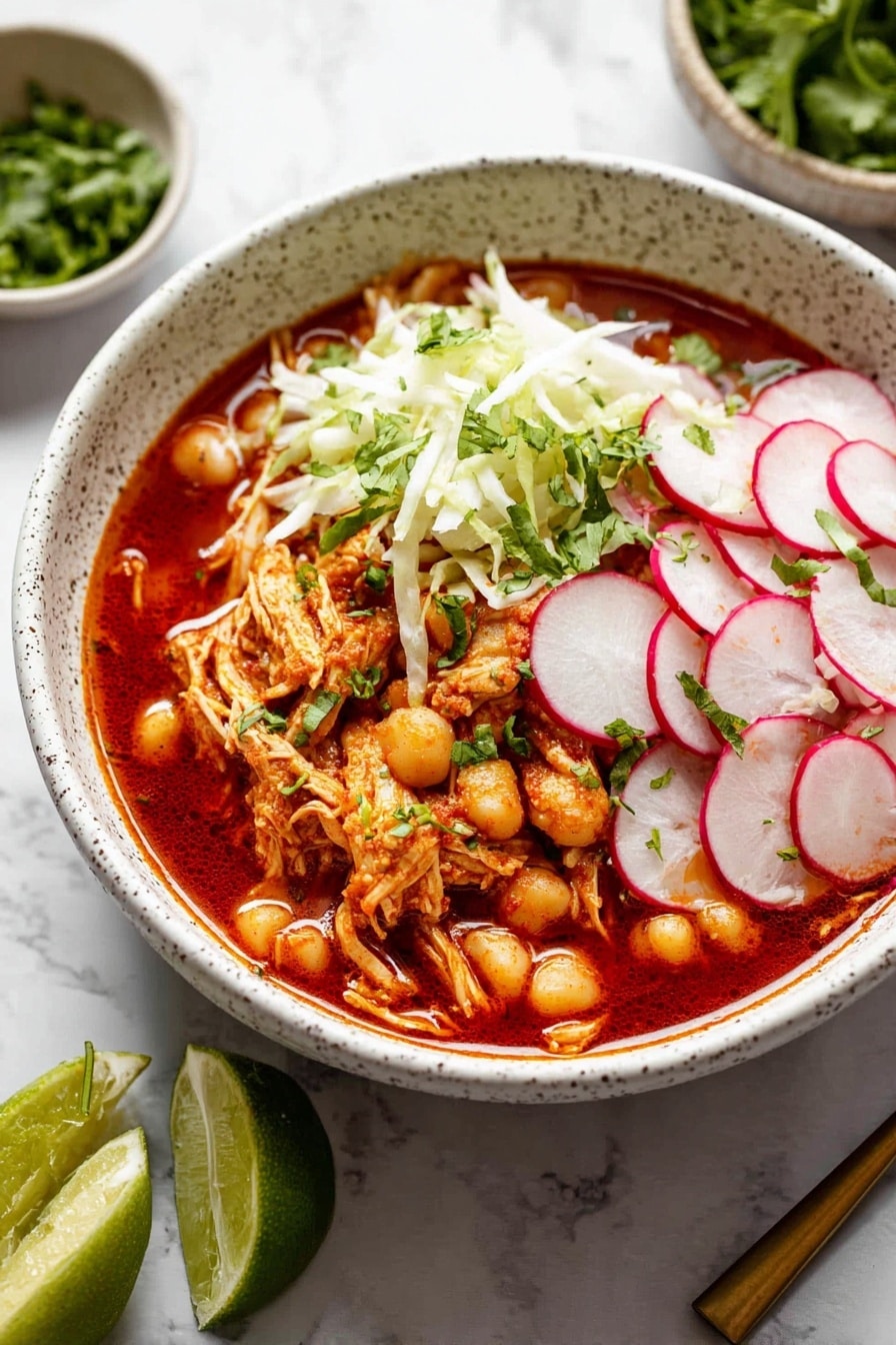 This Easy Chicken Pozole recipe offers a flavorful and hearty Mexican stew featuring tender shredded chicken simmered in a rich broth of authentic red enchilada sauce, hominy, and classic spices. Perfect for a comforting family meal, it’s garnished with fresh cabbage, cilantro, radishes, and lime for a vibrant finish.