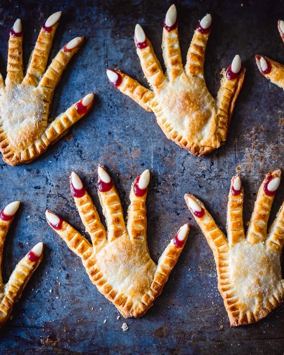 These Easy Halloween Hand Pies are a fun and festive treat perfect for spooky celebrations. Made with store-bought pie crust filled with raspberry or strawberry jam, they feature a playful hand shape topped with almond ‘nails’ for a creepy yet delicious dessert.