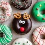 I’m all about adding personality here. For garnishes, I swear by Christmas-themed sprinkles—stars, tiny candy canes, red and green jimmies—and little edible candy eyes that bring the reindeer donuts to life. Pretzels are my go-to for antlers, and mini M&Ms pack an extra playful punch of color and crunch. These garnishes turn simple glazed donuts into festive eye candy.