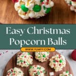 Celebrate the holiday season with these festive Christmas Popcorn Balls, featuring crunchy popcorn coated in a sweet marshmallow mixture and sprinkled with colorful red and green M&Ms and festive sprinkles. Perfect as a fun treat or party snack, these popcorn balls are easy to make and sure to bring joy to any holiday gathering.